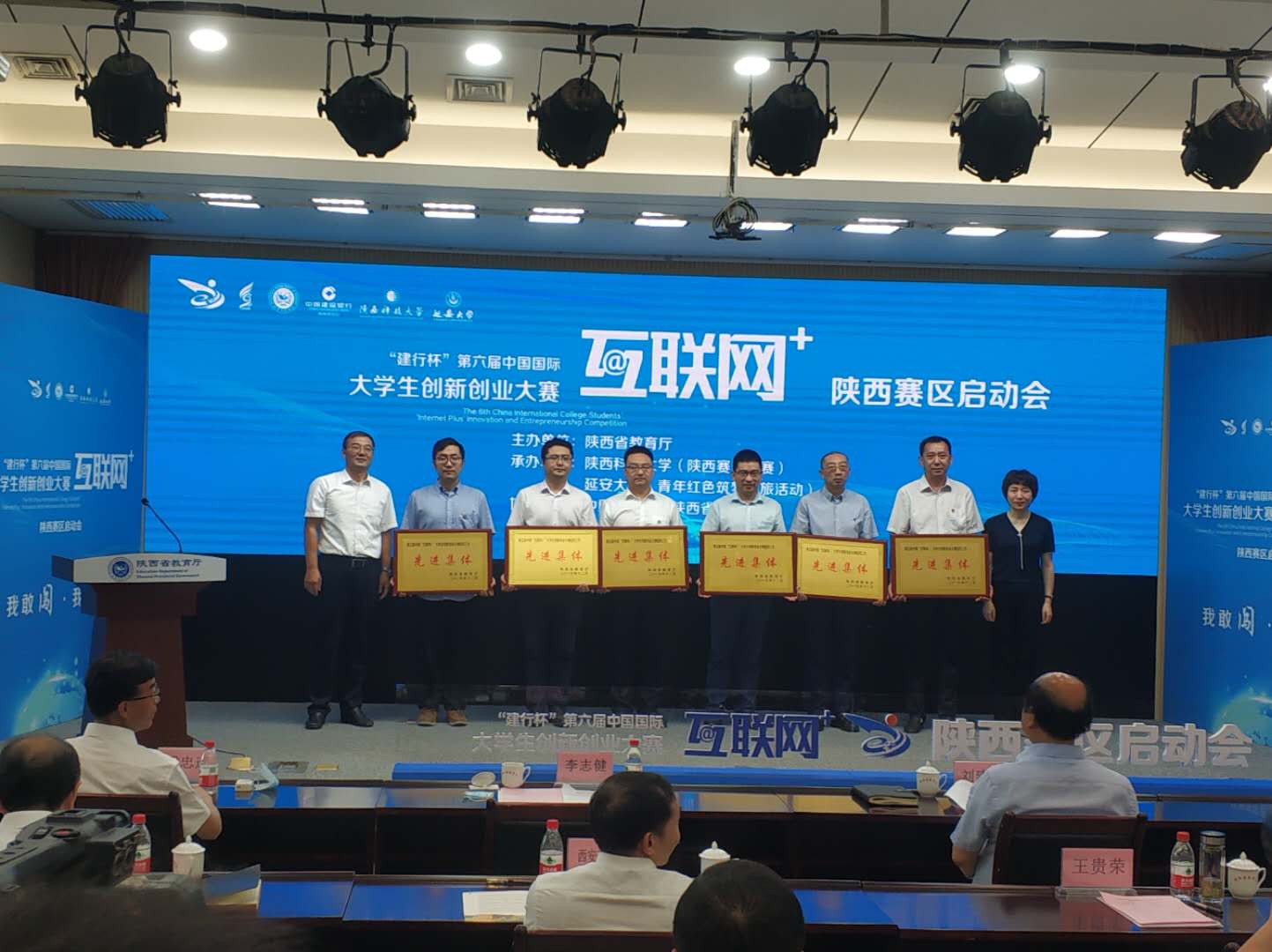 会上,陕西科技大学、延安大学、中国建设银行陕西省分行相关领导和负责同志进行了致辞。会议宣读了《关于表彰第五届中国“互联网+”大学生创新创业大赛组织工作先进集体和先进个人的通报》。西安科技大学在大赛组织工作中作出突出贡献被授予“特别贡献奖”,王贵荣代表英国365集团官网领奖。同时,英国365集团官网教务处、团委被授予大赛组织工作“先进集体”,刘琳、杨川、郭婷、周学刚四位同志被评为大赛组织工作“先进个人”。