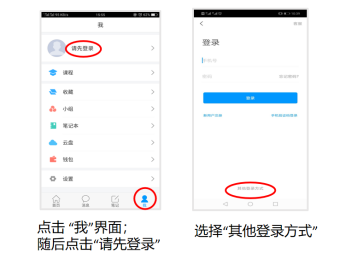 打开安装好的学习通App,可以看到如下图左的应用首页,点击右下角的“我的”,进入如下中图的界面,点击上方灰色头像,选择下方“其他登陆方式”输入统一身份认证账号及密码登陆即可。