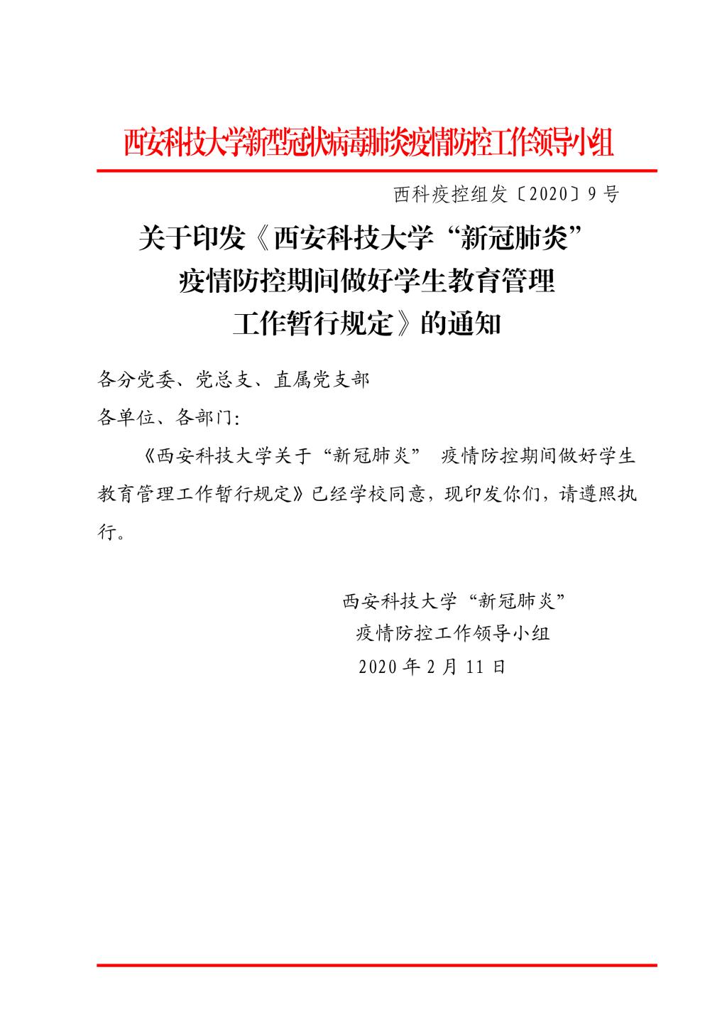 关于印发《英国365集团官网”新冠肺炎“疫情防控期间学生教育管理方面的暂行规定》的通知(西科疫控组发9号)
